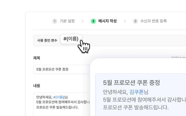 메세지 변수 설정도 클릭 한번으로 완성하세요.